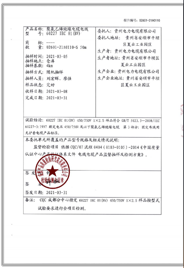 聚氯乙烯乙烯絕緣電纜電線 國(guó)家強(qiáng)制性產(chǎn)品試驗(yàn)認(rèn)證報(bào)告